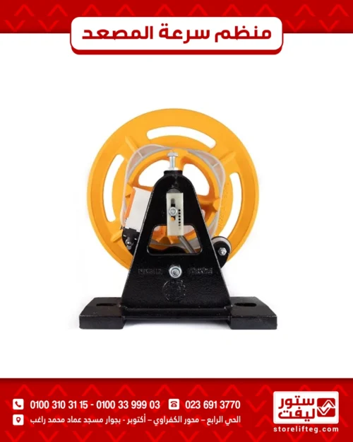 .آلية العمل: إذا تجاوز المصعد سرعته المحددة، يقوم المنظم بتفعيل نظام فرامل الأمان (البراشوت) لإيقاف الكابينة فوراً